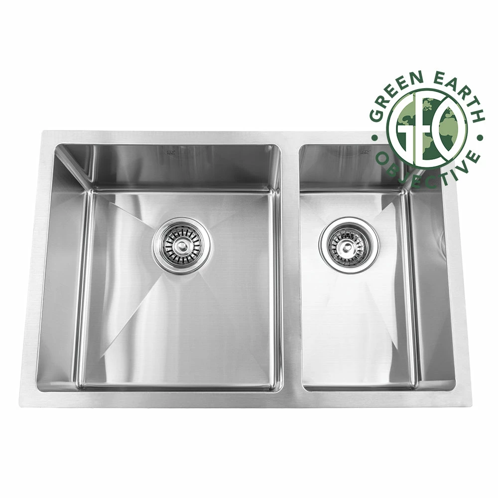 Carefully designed with a hand-crafted corner radius, the undermount HANA KLR GEO features double offset bowls, a soundproofing system, and a satin finish. It is made from stainless steel which makes it resistant to corrosion and provides an attractive modern appearance.