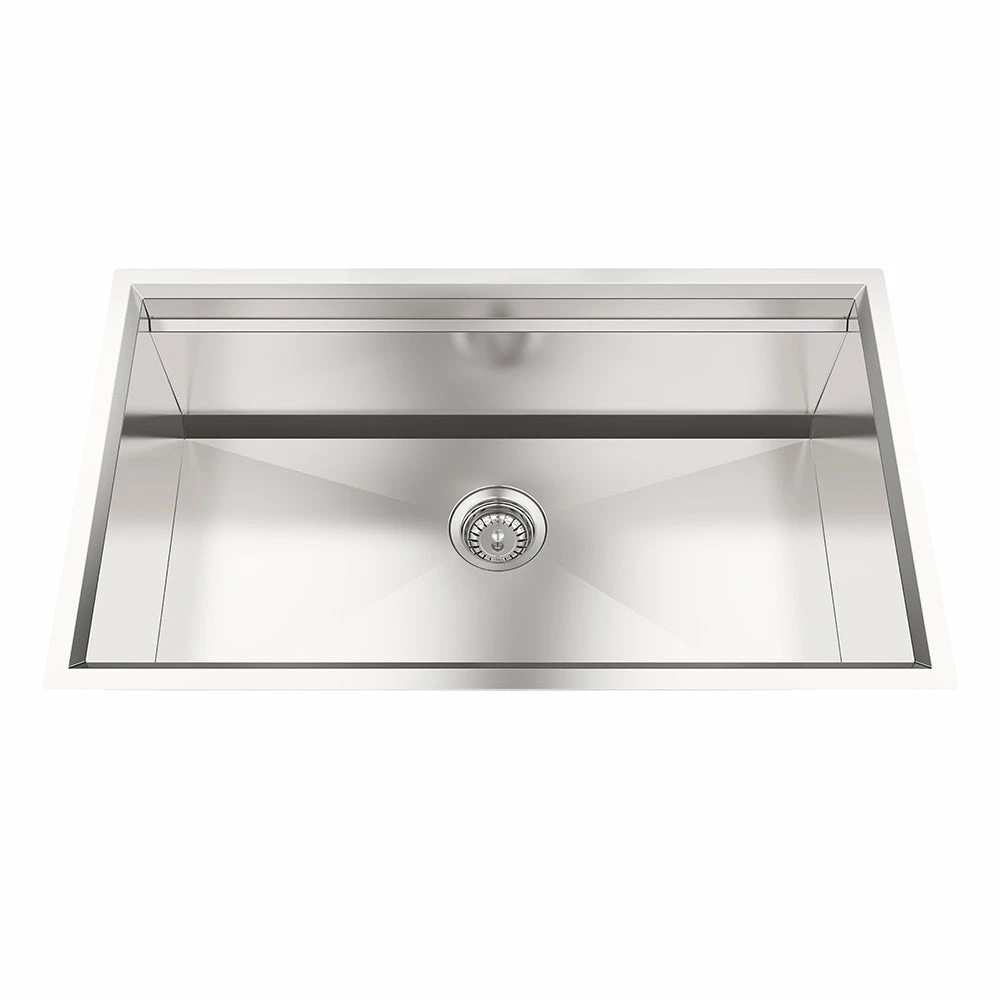 The ultimate in kitchen systems solution. This modern large undermount single bowl sink is built with 16 gauge surgical stainless steel. Its design features a flush reveal, satin finish, and a sound-resistant system.