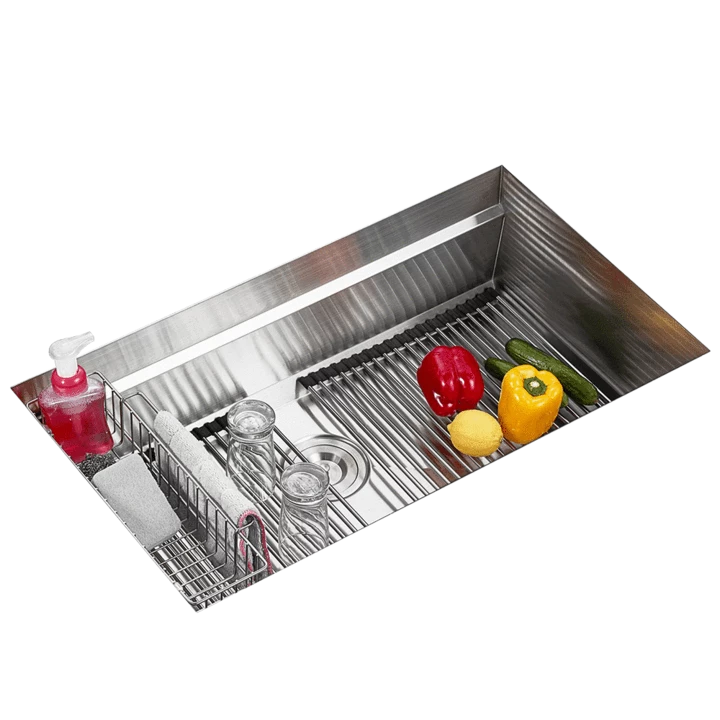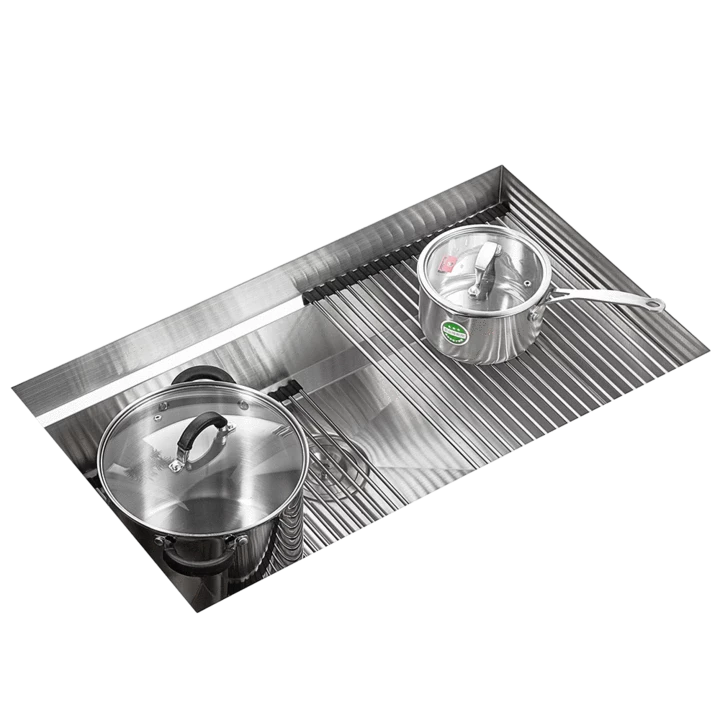 It comes with a variety of kitchen essential accessories that can be attached to the sink delivering functionality, more space, and style to your kitchen. Including a flat basket strainer, cutting board, colander plate, dish rack, cutlery rack, and two roll mats. Designed with straight corners maximizing your freedom of movement and it is hand-crafted to perfection.